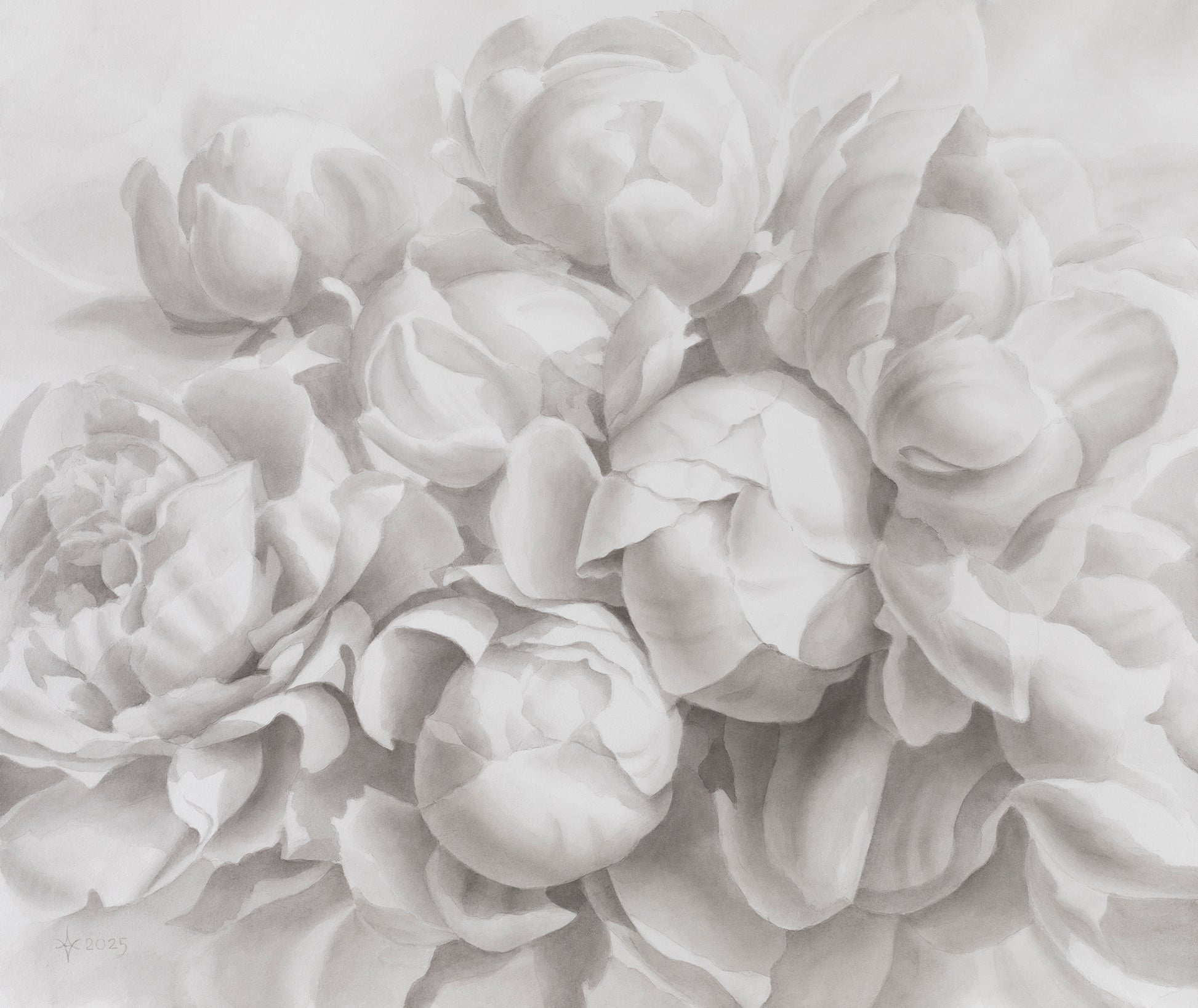 Akvarelės paveikslas „Tylus žydėjimas“ vaizduoja švelniai besiskleidžiančius juodai baltus bijūnus, kurių subtilūs vos akiai matomi pustoniai kuria ramią ir laikui nepavaldžią nuotaiką. Šis kūrinys suteiks interjerui rafinuotos elegancijos, pripildys erdvę harmonijos ir subtilaus išskirtinumo.
